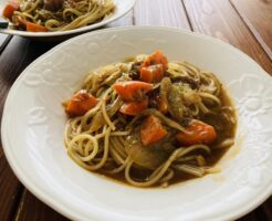 デミグラスカレーパスタ 休日のランチに作ったパスタです。 その名もデミグラスカレーパスタ。 電子レンジで麺を茹でている間に、ささっと市販のデミグラスカレーのルーでソースを作り、茹で上がった麺とからめたら出来上がりです。 ・・・