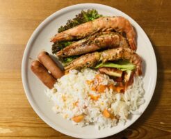 洋食 ガーリックシュリンプのワンプレート晩ごはん。 大きなアルゼンチン産赤海老のガーリックシュリンプと、一緒に焼いたウインナー、レタス、トマト、酢玉ねぎ、人参ごはんが一皿に。 頑張ったのはガーリックシュリンプのみです。 ・・・