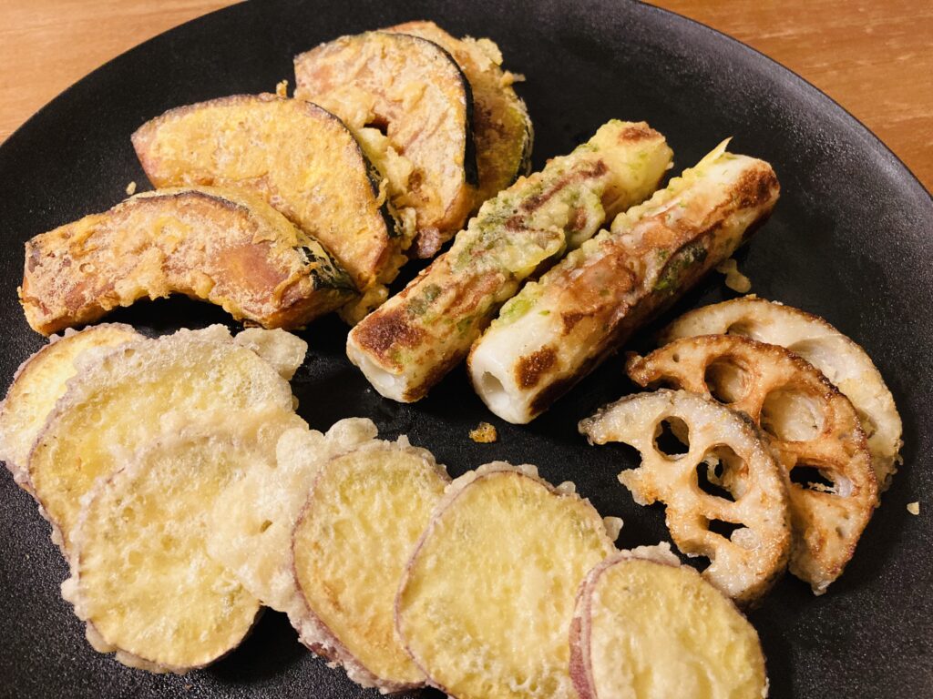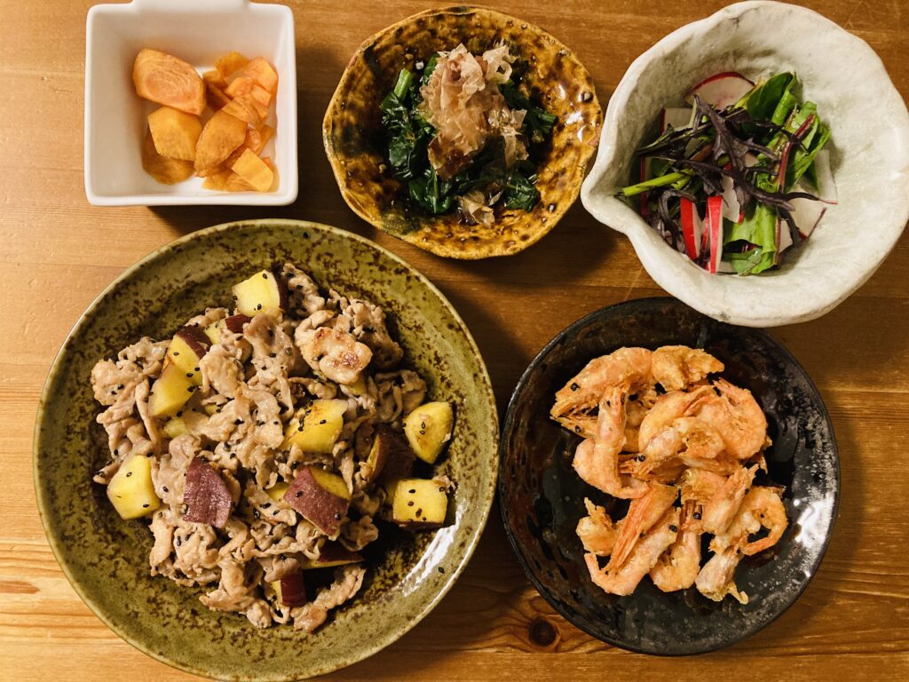 晩ごはん 昨日に引き続き、家族がそろった日の晩ごはんです。 メニューは豚肉とサツマイモのゴマ塩炒め、エビの素揚げ、ほうれん草のお浸し、サラダ、柿です。 メインのおかずは大皿によそった豚肉とサツマイモのゴマ塩炒めです。 豚・・・