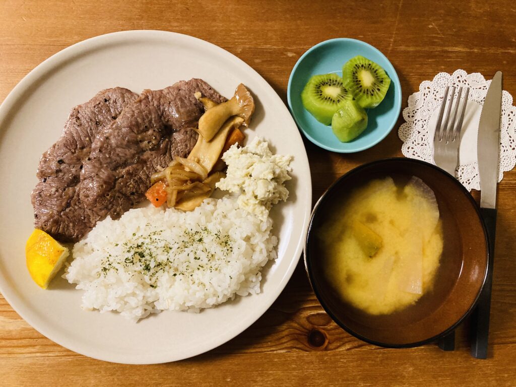 ステーキ晩ごはん 久しぶりの牛ステーキ晩ごはんです。 息子とスーパーへ行くとつい奮発してしまうので要注意。 夫と行っても夫が余計なものをどんどんカゴに追加するので要注意。 スーパーは一人で行くのが一番!(我が家の場合)と・・・