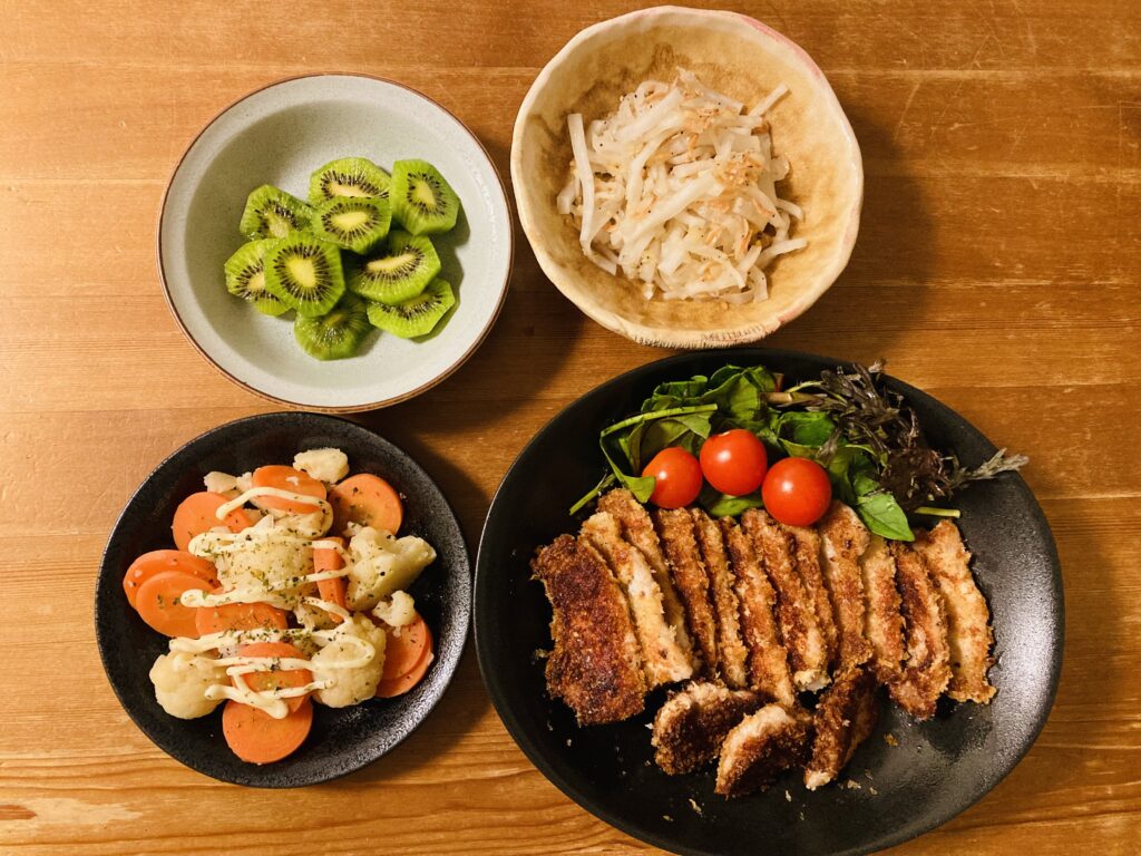 晩ごはん 息子の塾がなく、夫の仕事も休み。 家族がそろった日の晩ごはんは、いつものように個別によそわず大皿でドーン。 メニューはトンカツ、人参とカリフラワーの温サラダ、大根と桜エビのサラダ、キウイです。 ごはんとみそ汁に・・・