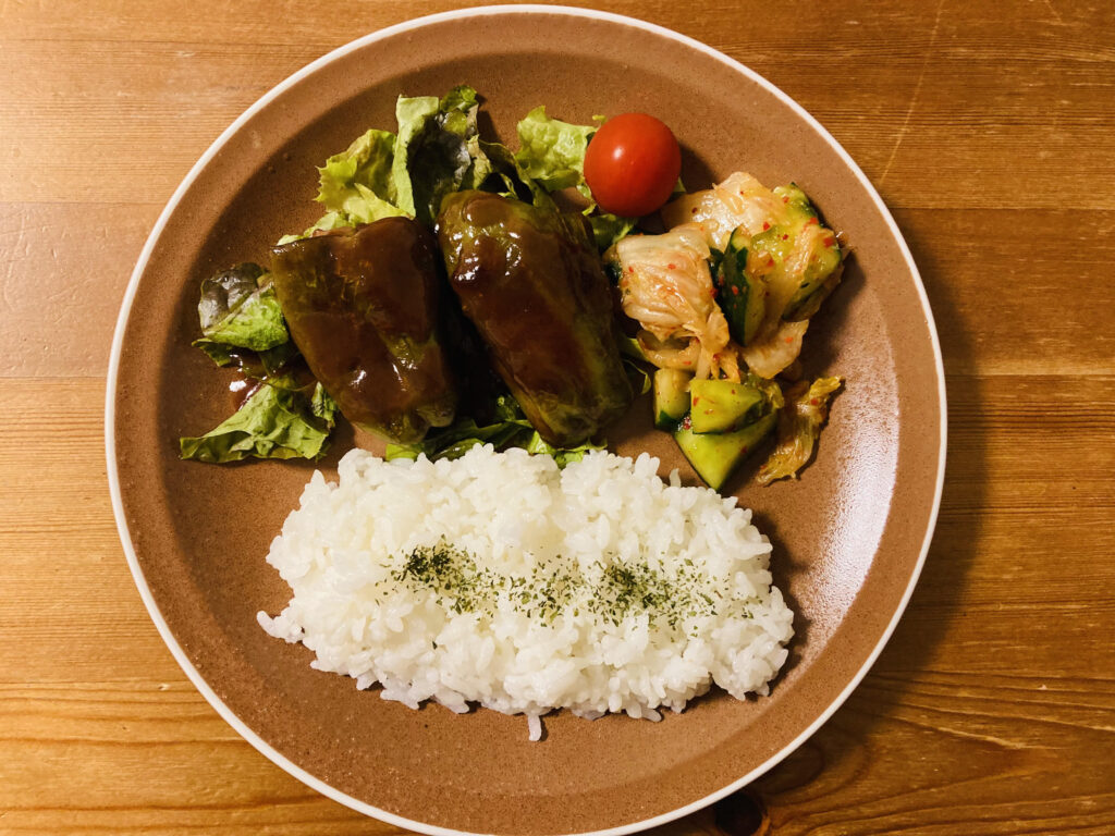 豚コマのピーマン肉詰め。アジ焼き定食。