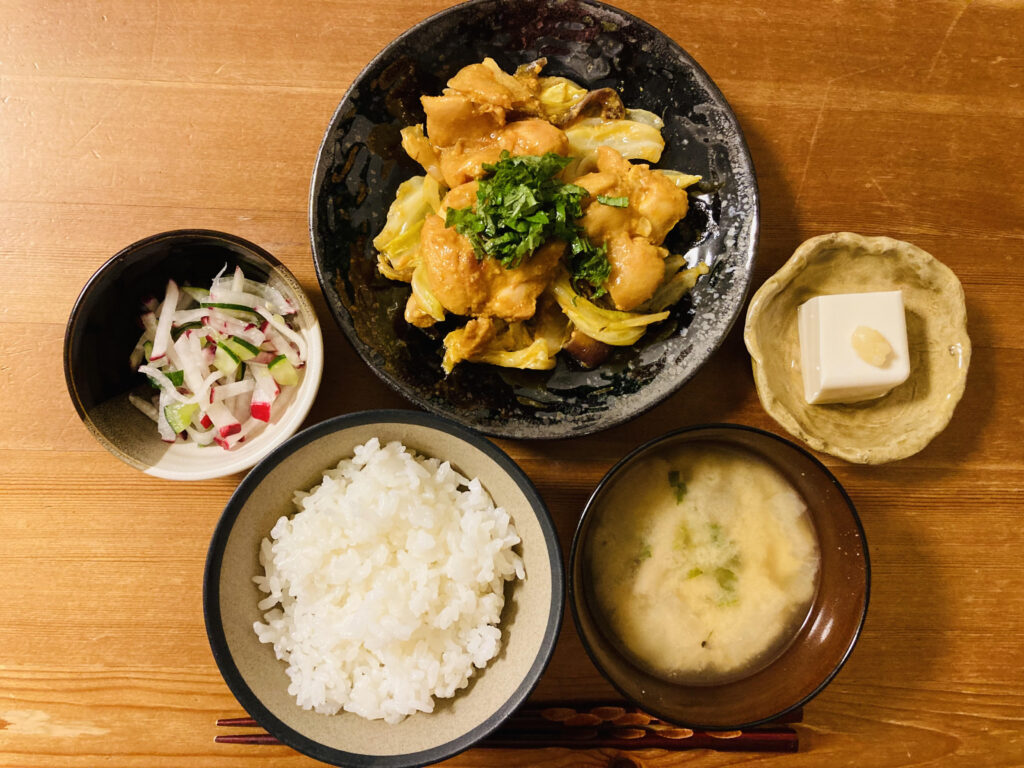 鶏もも肉の味噌炒め 晩ごはんの献立は、鶏もも肉の味噌炒め、キュウリとラディッシュのサラダ、冷奴、ごはん、みそ汁です。 素朴な和食の晩ごはん。 鶏もも肉の味噌炒めは、味噌の下味がついた鶏もも肉をゴマ油で炒め、玉ねぎとキャベ・・・