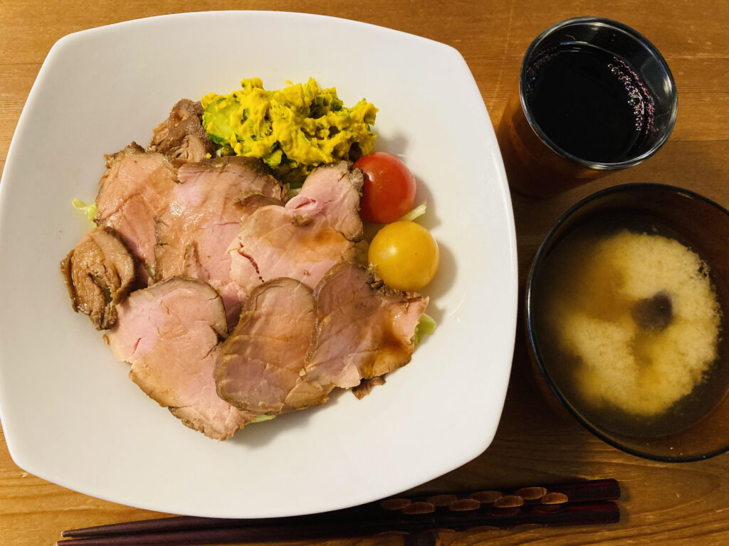 晩ごはん お取り寄せグルメのローストポークを丼にしました。 丼にごはんをよそい、レタス、ローストポーク、カボチャのサラダ、ミニトマトをのせて付属のタレをかけたら完成です。 作ったのはカボチャのサラダとみそ汁のみで、あとは・・・