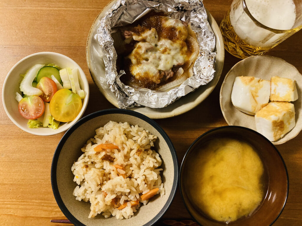 晩ごはん 晩ごはんのメニューは、豚肉のホイル焼き、バター醤油はんぺん、野菜サラダ、炊き込みご飯、みそ汁です。 豚肉のホイル焼きの具は、玉ねぎと塩で下味をつけた豚肉。それにチーズをのせて焼くいつものホイル焼きです。 おろし・・・