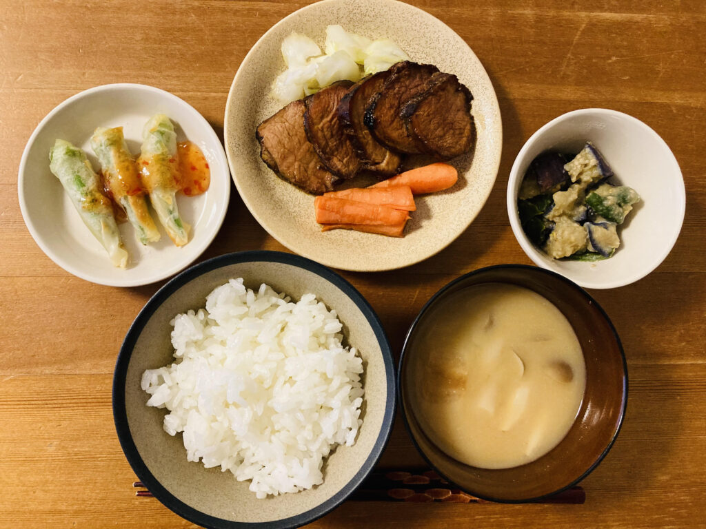 晩ごはん 晩ごはんのメニューは、ローストビーフ(付け合わせはロースト人参とセロリの塩もみ)、ナスとピーマンの味噌和え、オクラの包み焼き、ごはん、みそ汁です。 ローストビーフのように薄切りでいただくことが多いローストポーク・・・