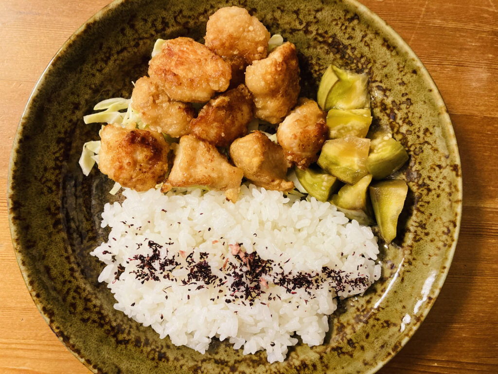 ワンプレート晩ごはん やっとスーパーへ行き、鶏胸肉と鶏もも肉を買ってきました。 鶏づくし。 晩ごはんのおかずは鶏胸肉で作った唐揚げと、青ナスの煮びたしです。 ゆかりごはんと一緒にワンプレートにまとめました。 唐揚げの下味・・・