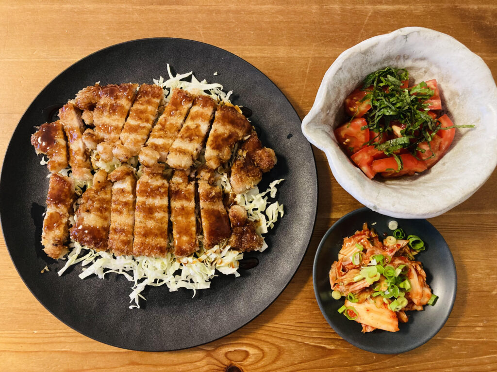 晩ごはん トンカツの日。 献立はトンカツ、トマトと大葉の中華和え、キムチ、ごはん、みそ汁です。 トンカツは3人分で3枚揚げました。 大皿でも一度にのりきらなかったので、この後おかわりしました。 作り方 豚ロースを包丁でた・・・