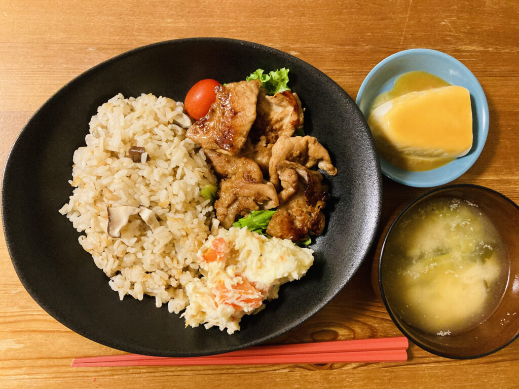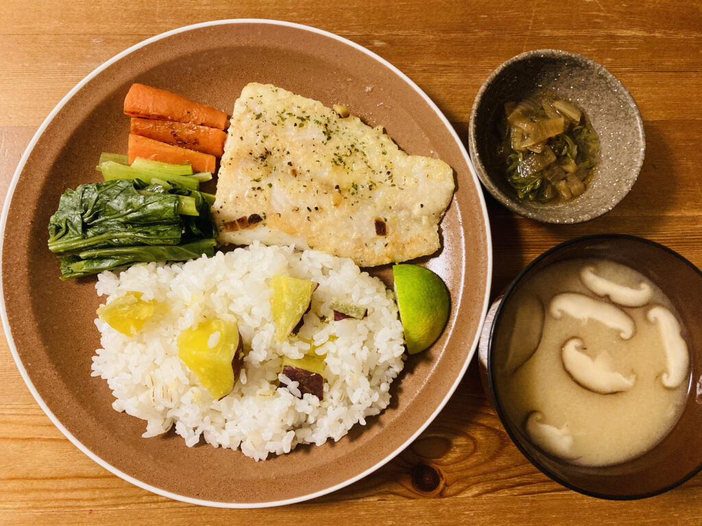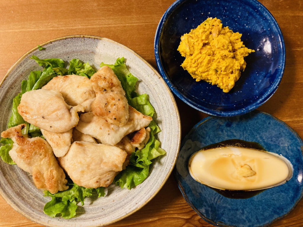 素朴な晩ごはん 素朴で安上がりな晩ごはん。 おかずは鶏胸肉で作った塩唐揚げ、ナッツ入りカボチャサラダ、冷奴。 あとはいつものごはんとみそ汁で完成です。 鶏胸肉には下味に、塩コショウと少量の砂糖をつけました。 あとは片栗粉・・・