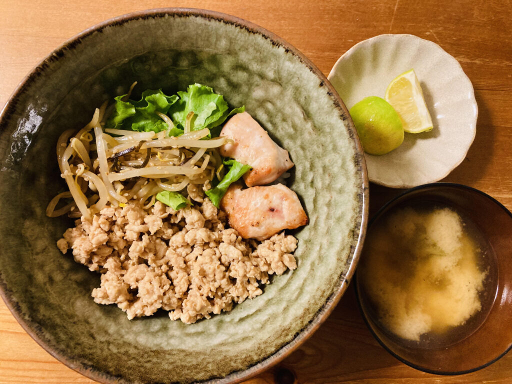 鶏胸肉のそぼろ丼 手早く作れる丼の晩ごはん。 丼にのせたのは鶏胸肉で作ったそぼろと、鶏胸肉の焼き鳥(味付けはほりにし)、モヤシと塩昆布のナムルです。 地元の野菜市場で買ってきたカボスを絞っていただきました。 息子が塾へ行・・・
