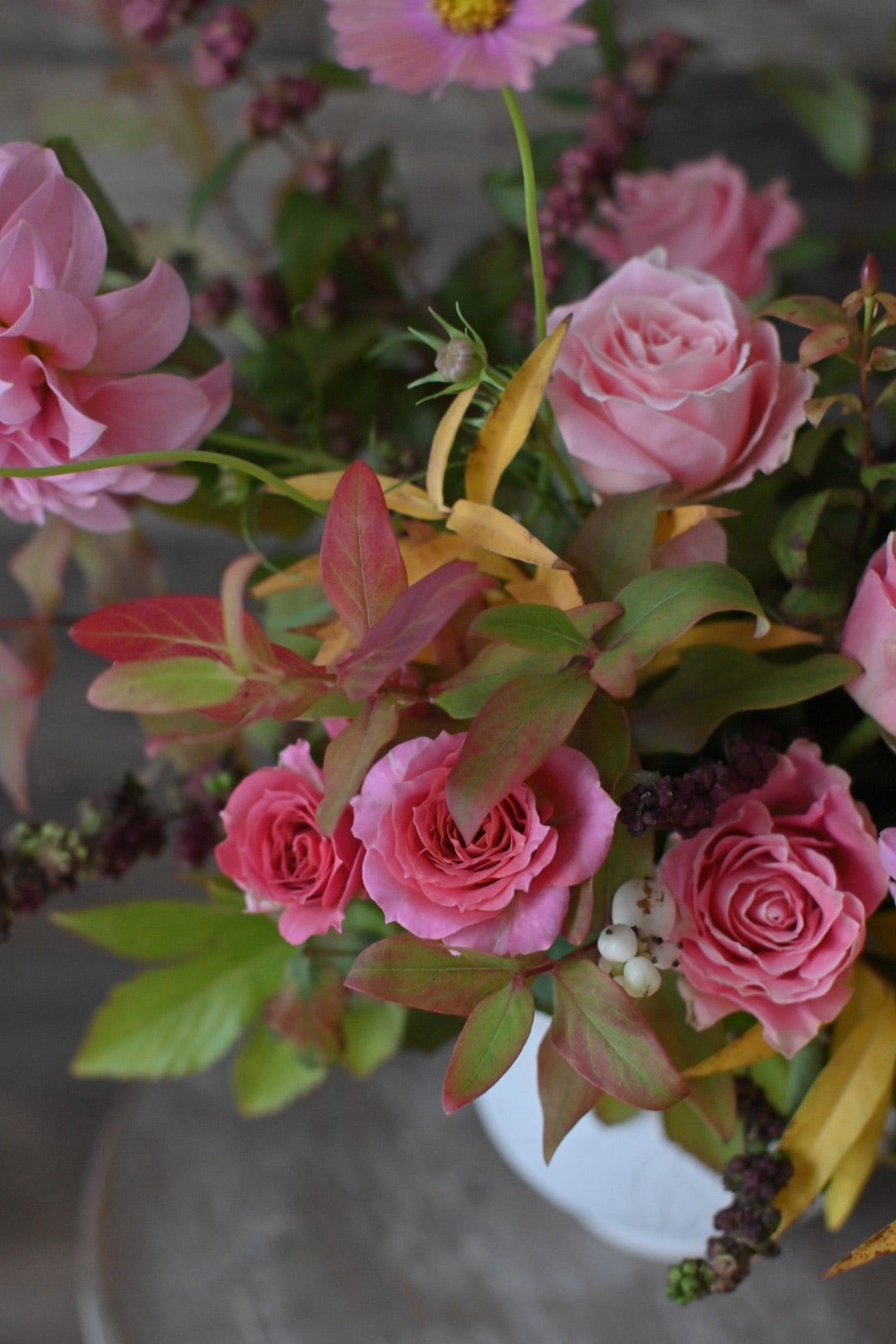 花を飾る ようやく暑さが落ち着き、エアコンなしでも花が長持ちするいい気候になりました。 上の写真は地元の野菜市場で購入した花です。 秋色なところと、花と葉のバランスに一目ぼれしてカゴへ入れました。 ちょうどよい大きさの花・・・