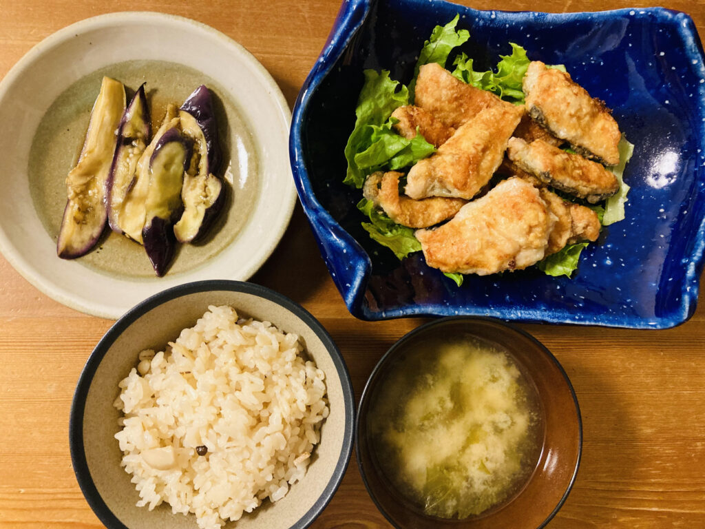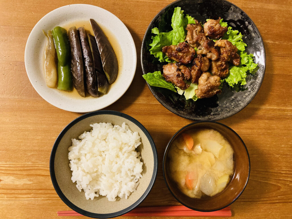 晩ごはん 豚肉で作った竜田揚げがメインのおかずの晩ごはん。 副菜はナスとピーマンとミョウガのお浸し。 あとはごはんとけんちん汁です。 息子と一緒にごはんもけんちん汁もおかわりしました。 豚肉の竜田揚げ 豚肉を生姜と醤油、・・・