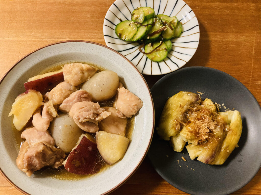 晩ごはん メインのおかずは土鍋でゆっくりコトコト炊いた、鶏もも肉とサツマイモとコンニャクの煮物です。 副菜は焼きナス、キュウリの塩昆布漬け。 最近は秋らしい食材がよく並びます。 キュウリは夏ですが、夫の実家で親戚が作った・・・