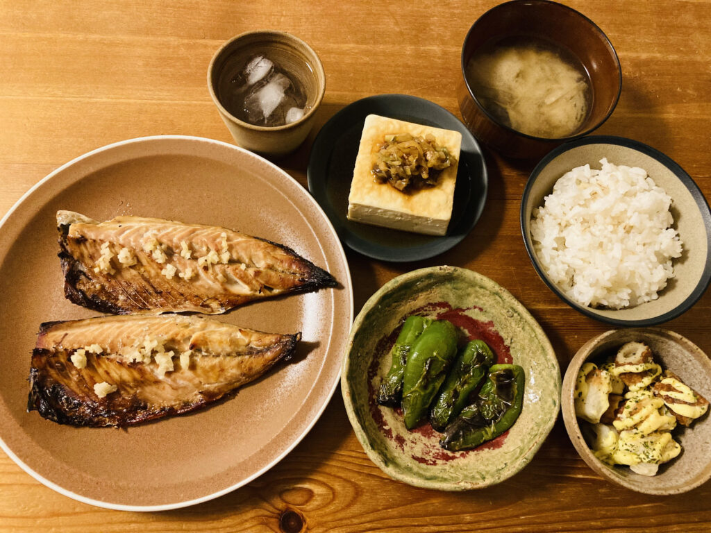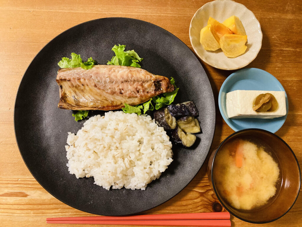 鯖ワンプレート 晩ごはんは鯖のスパイスハーブ焼き、ナス味噌和え、冷奴、柿、みそ汁です。 鯖には塩コショウ、タイム、クミン、コリアンダーをつけて焼きました。 ナス味噌和えはレンチン調理です。 切ったナスを600w3分チンし・・・