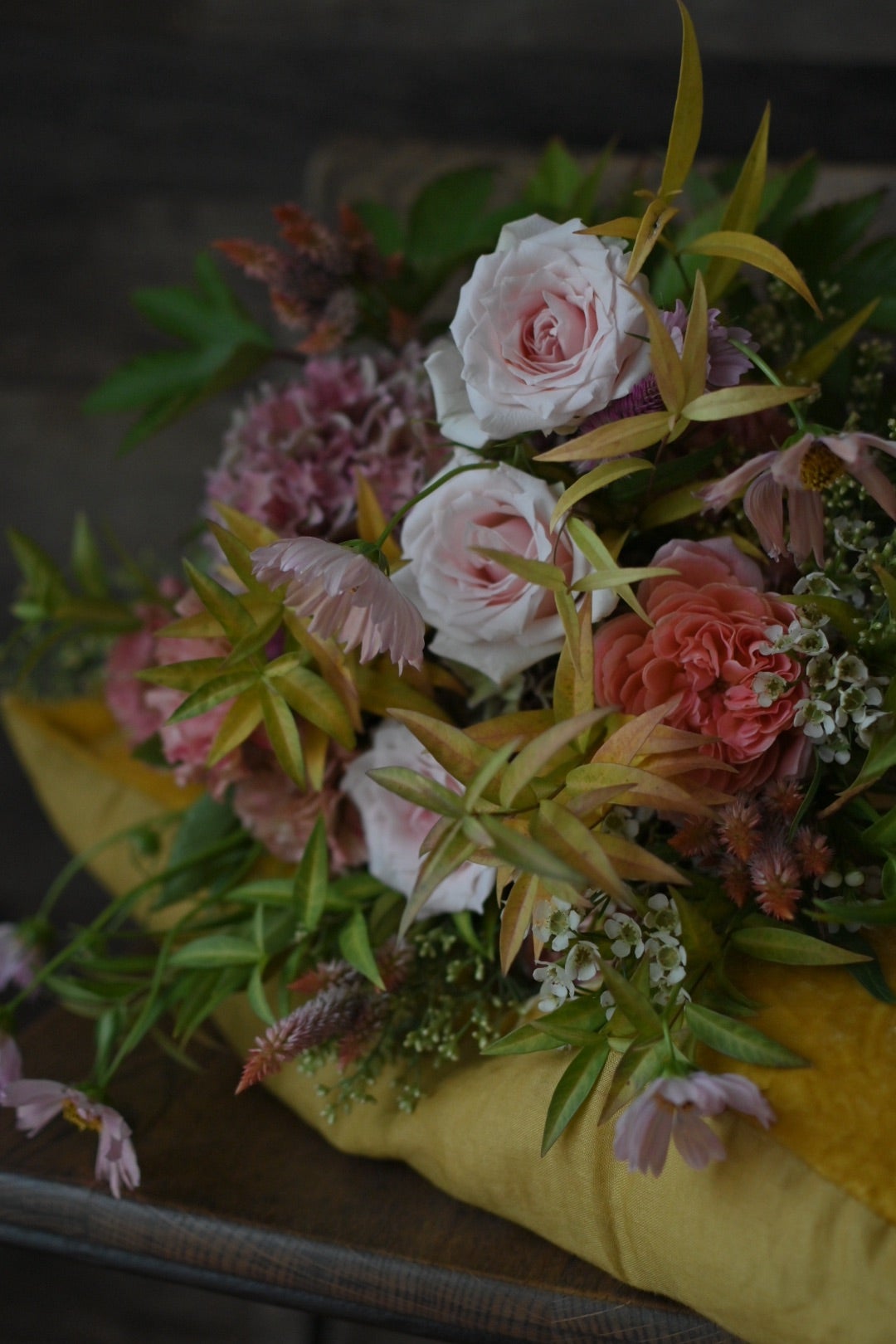 ねこチャンわんチャンを救う秋色紫陽花とバラとコスモスのブーケ