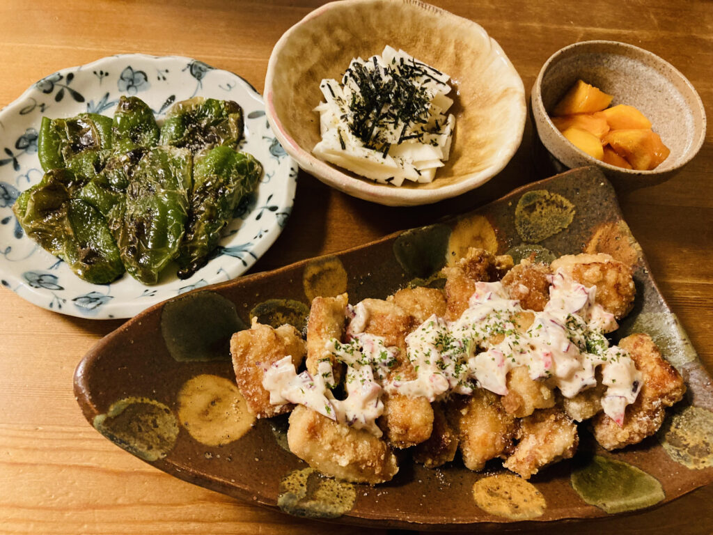 唐揚げ晩ごはん メインのおかずは鶏胸肉で作った唐揚げです。 副菜は焼きピーマンと長芋。 デザートは柿。 素朴な晩ごはんの完成です。 唐揚げはちょっと一工夫。 上にラディッシュのタルタルソースをかけました。 ラディッシュの・・・