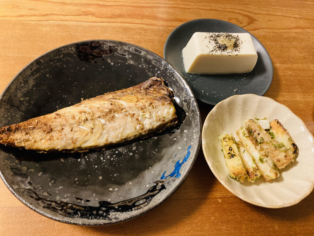 晩ごはん 晩ごはんのおかずは鯖のスパイス焼き、長芋の磯辺揚げ、冷奴です。 これだけだと野菜不足なので野菜はみそ汁で補給しました。 みそ汁は栄養の調整ができて便利、美味しい、温まる。最高ですね。 鯖は洗って拭いてから、塩と・・・