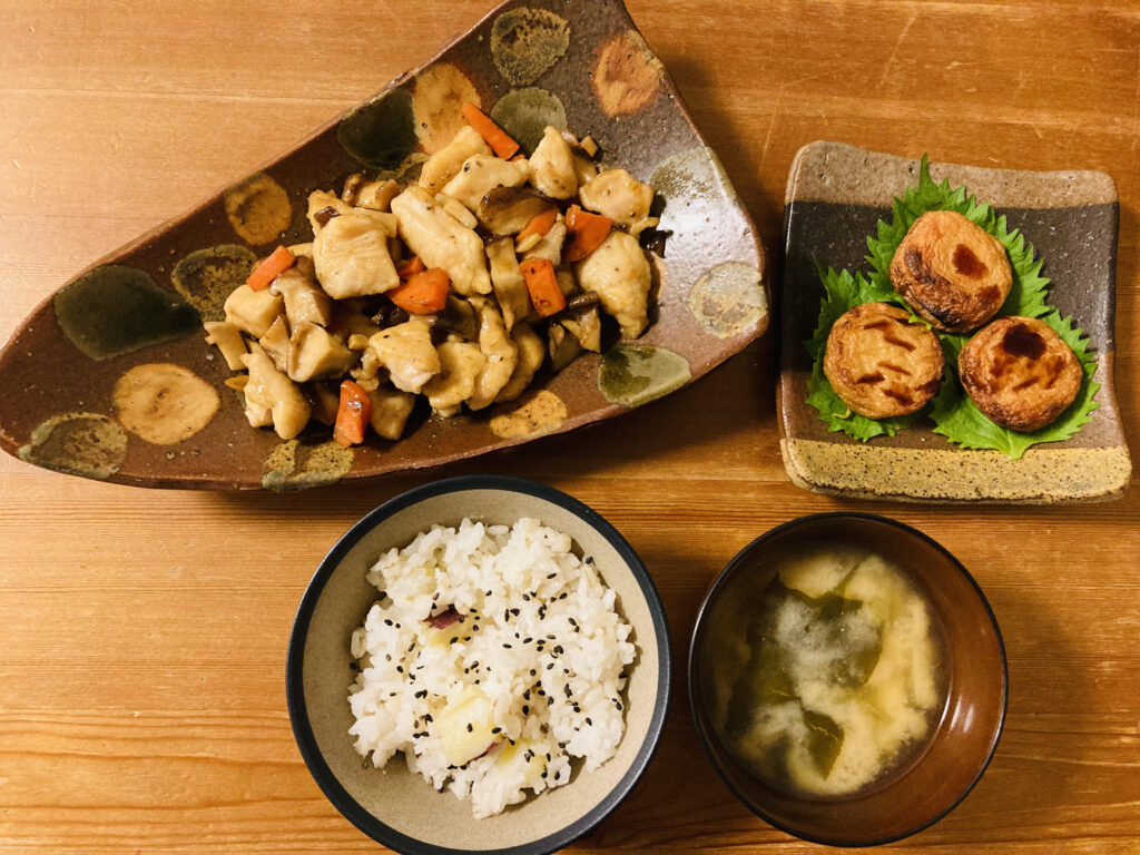 秋です 晩ごはんの献立は、鶏肉とキノコの炒め物、さつま揚げ、さつまいもご飯、みそ汁です。 さつまがふたつ並びました。 ここ数日昼間は暑い日が続いていますが、朝晩は涼しく、やはり秋を感じます。 あたたかいご飯が美味しい季節・・・