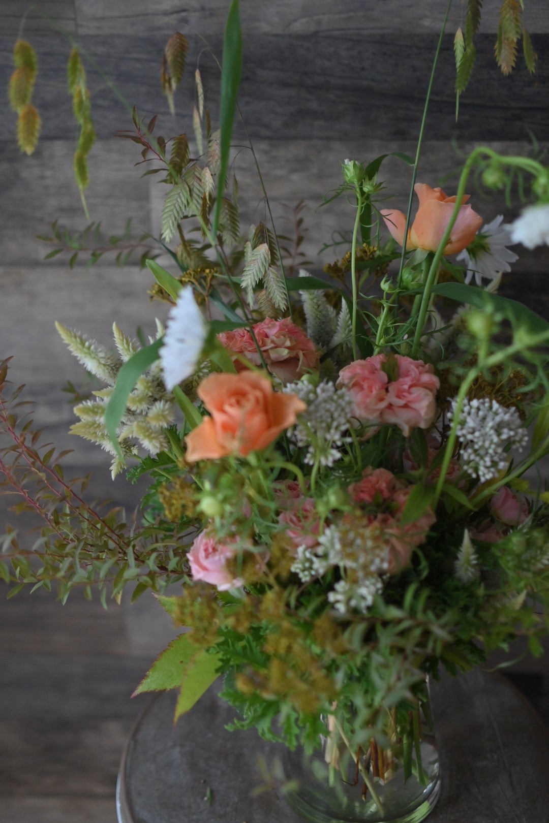 バラ3種とコスモス秋の草花の投げ入れ