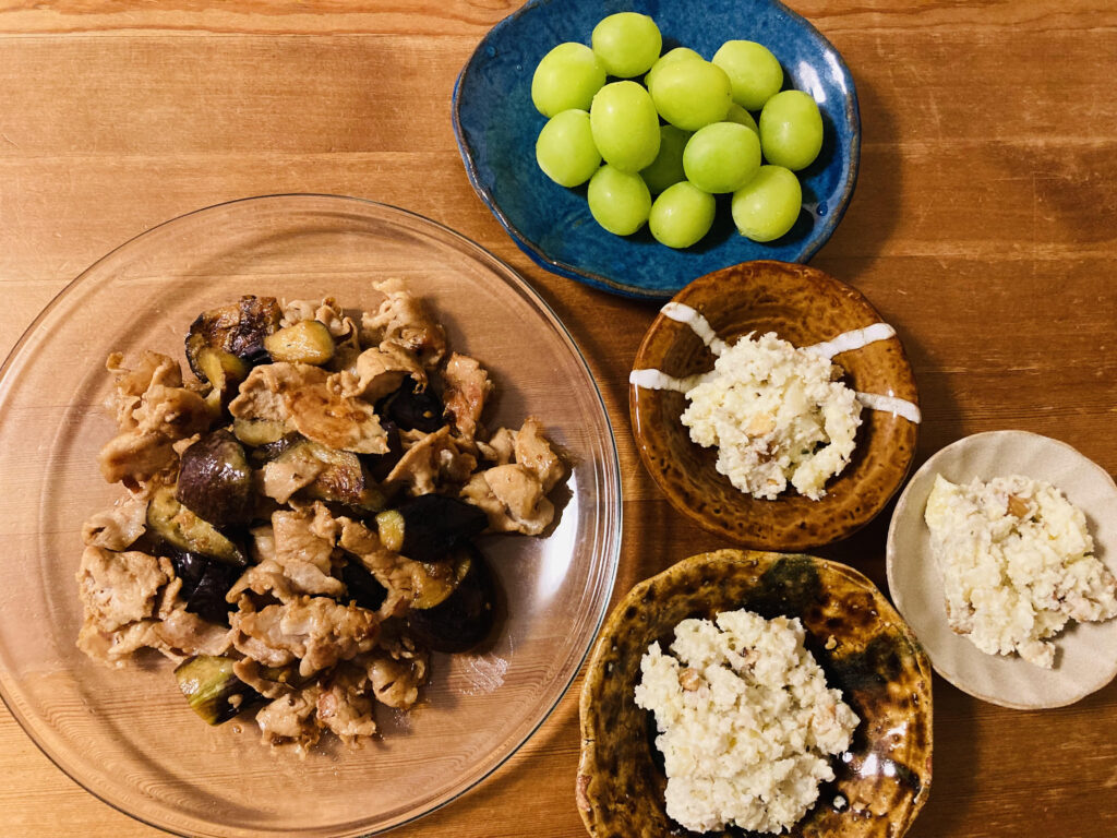 晩ごはん みんな揃った日の晩ごはん。 メインの大皿料理は豚肉とナスのスタミナ炒め。 小皿はクルミ入りポテトサラダ。 そしてこの日の楽しみはなんといってもデザートのシャインマスカット! 最近色んなスーパーでシャインマスカッ・・・