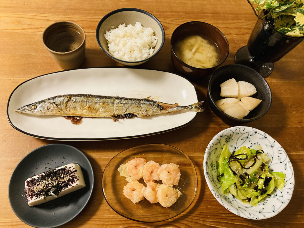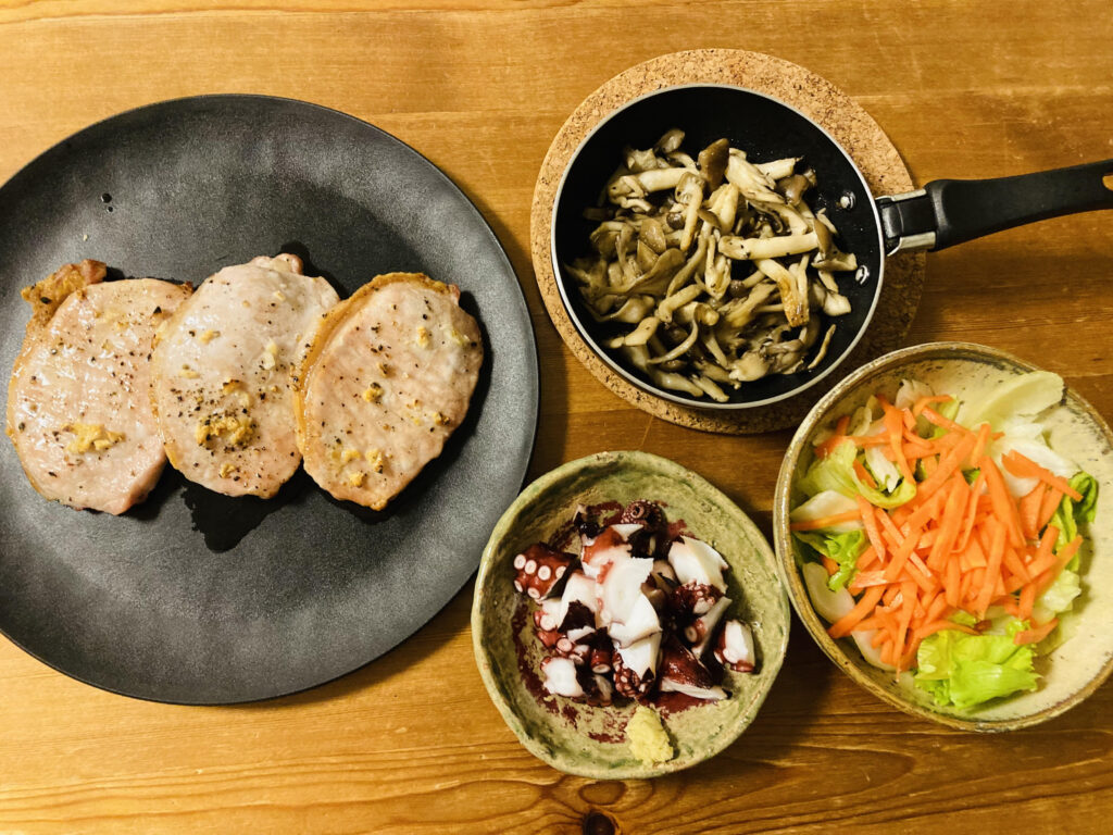 晩ごはん 家族が揃った日の晩ごはん。 メインのおかずはトンテキ、副菜はタコの刺身、キノコのソテー、野菜サラダです。 どれも調理の工程が少ないシンプルな料理ばかり。 キノコのソテーはフライパンのまま食卓へ並べ、熱々をいただ・・・