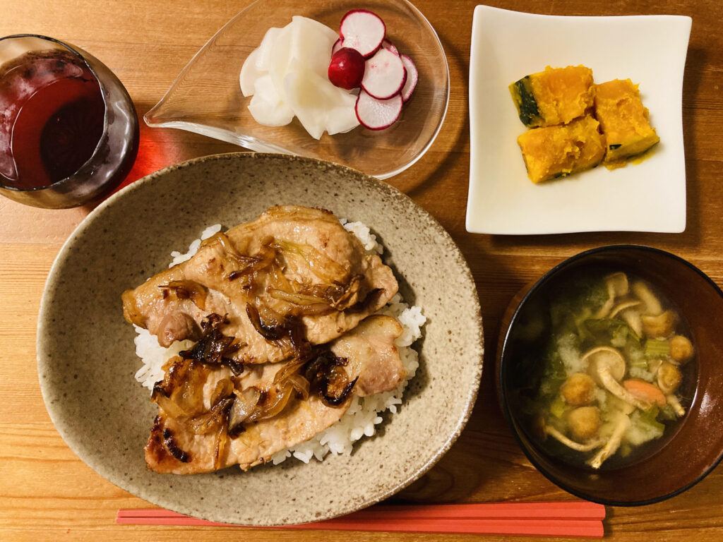 晩ごはん 晩ごはんのメニューは豚ロースの生姜焼き丼、塩バターカボチャ、カブとラディッシュの浅漬け、なめこのみそ汁です。 色味も味も癒し系。 豚ロース丼は、豚ロースを玉ねぎと生姜のみじん切りと一緒にゴマ油で焼きました。 味・・・