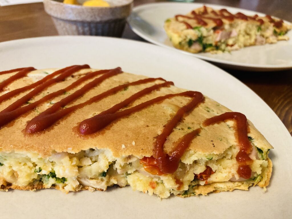 ケークサレランチ 休日のケークサレランチです。 我が家流に、家にあるものを寄せ集めて作りました。 お肉は入っていないけれど、タンパク質はたっぷり入っています。 材料 ホットケーキミックス、ツナ缶、魚肉ソーセージ、大豆の水・・・