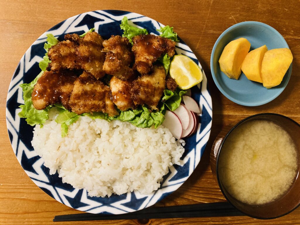 晩ごはん 鶏胸肉で作ったチキンカツのワンプレート晩ごはんです。 鶏胸肉を切って塩コショウで下味をつけて、冷蔵庫で1時間ねかせ、パン粉をまぶして揚げ焼きにしました。 揚げ焼きの前の工程は全部ビニール袋です。 パン粉をまぶす・・・