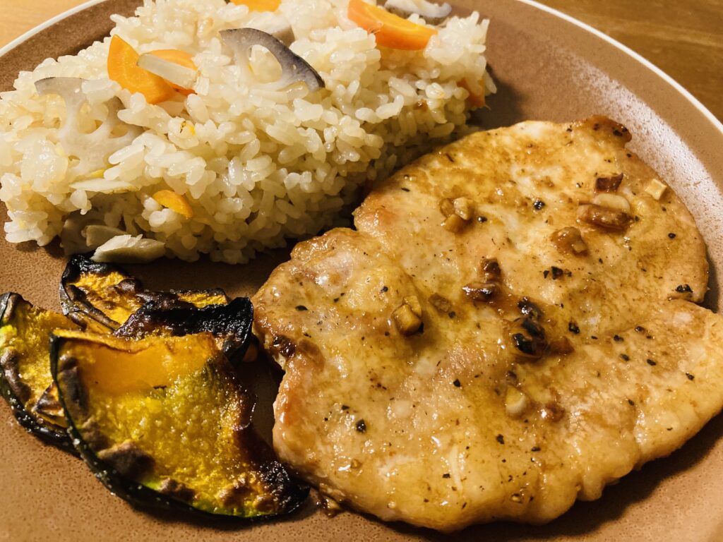 トンテキのワンプレート 息子が塾へ行く前にささっと食べられるよう、ワンプレートにまとめた晩ごはん。 メニューはトンテキ、カボチャのグリル焼き、根菜炊き込みご飯です。あとはみそ汁。 作るのも食べるのも負担がない晩ごはんです・・・