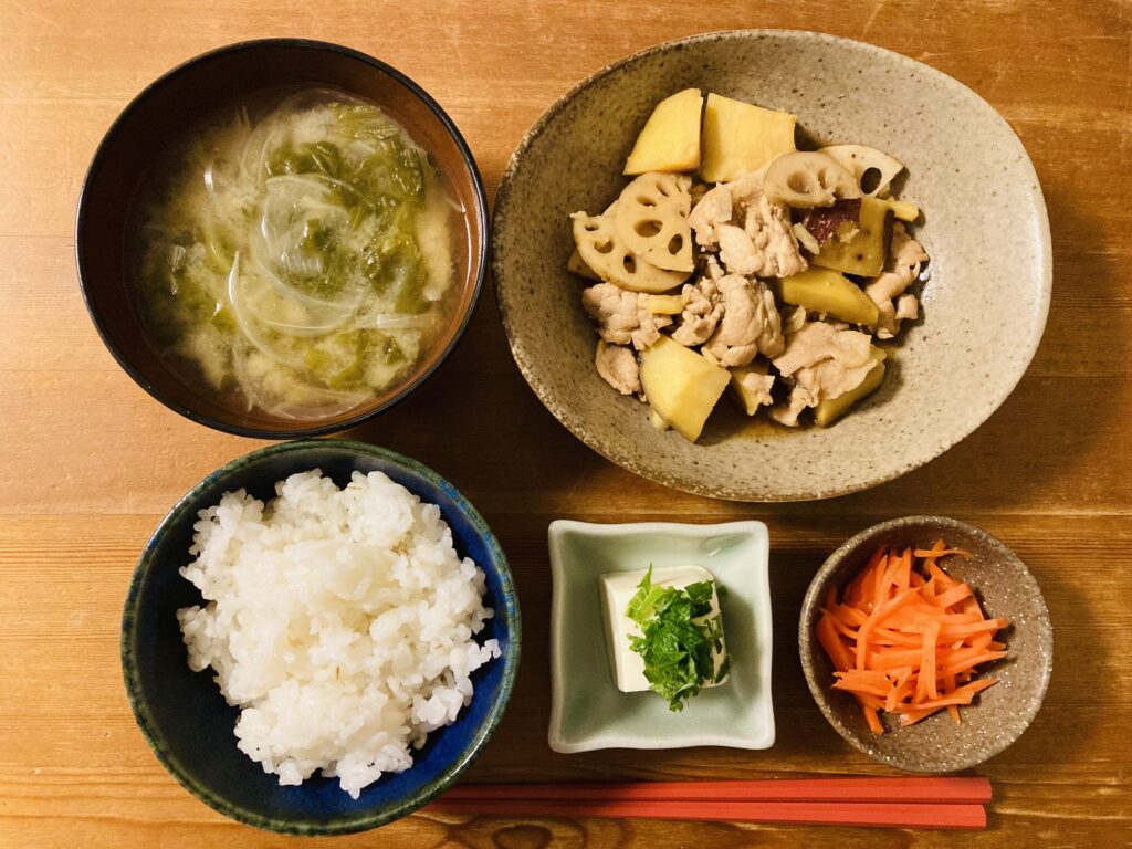 晩ごはん 寒い日は体が温まる根菜を、柔らかく美味しくいただきたい。 そんな日の晩ごはんです。 献立は豚肉と根菜の煮物、キャロットラペ、冷奴、ごはん、玉ねぎとレタスのみそ汁です。 晩ごはんに入っている根菜は、レンコン、さつ・・・