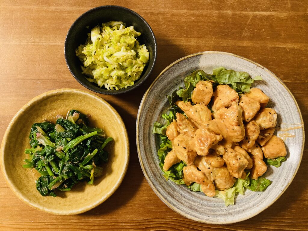 葉野菜多めの晩ごはん 家族が揃った日の大皿料理。 メインのおかずは鶏胸肉のオーロラソース和えです。 副菜はキャベツのナムルとほうれん草のゴマ和えです。 レタス、キャベツ、ほうれん草。 葉野菜が並び、緑色の食卓になりました・・・