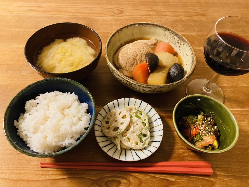 豚肉と野菜の煮物、野菜の簡単副菜。家での過ごし方