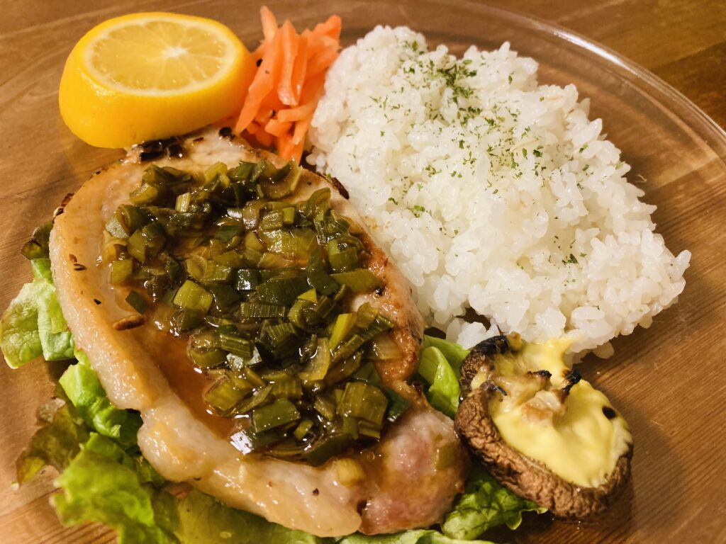 ワンプレート おかずとごはんを一皿にまとめました。 メインのおかずは豚ロースのソテー。 筋切した豚ロースに塩コショウと小麦粉をまぶしてオリーブオイルで焼いて、ネギダレをかけたら出来上がり。 ネギダレは耐熱容器に切ったネギ・・・