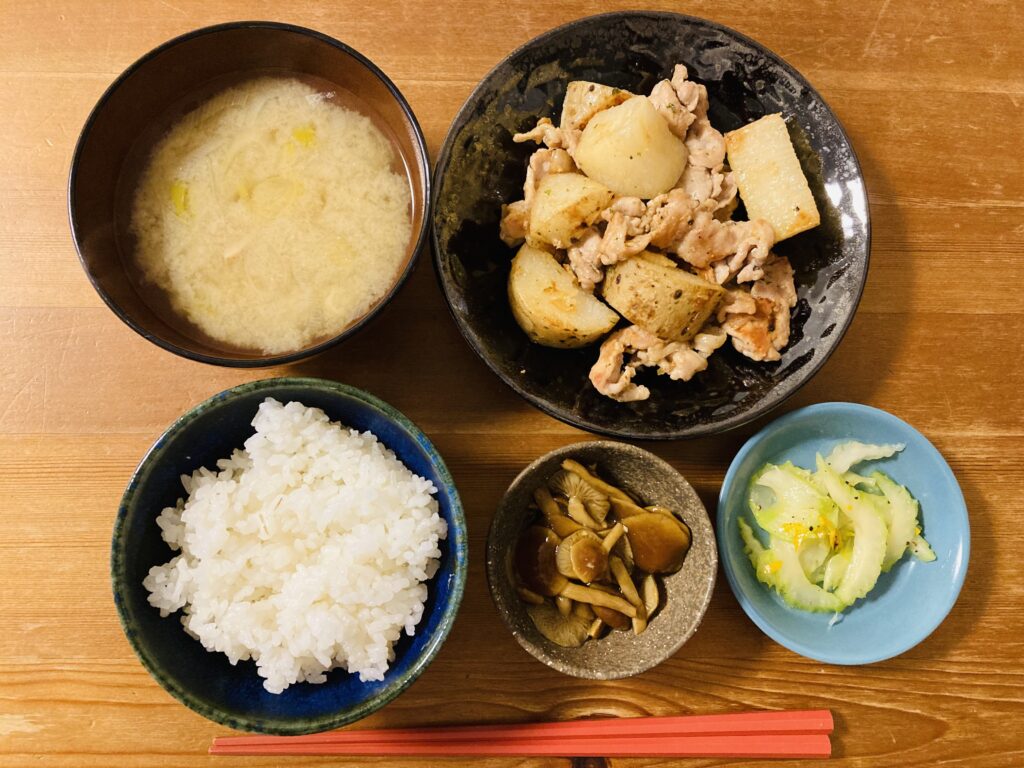 晩ごはん 適度な手間で適度な美味しさを、適度な量味わう。 それが日常のごはんに求めていることです。 息子と夫は食べ盛りのため量を増やして対応。 私は上の写真くらいの量でちょうどいい感じ。 この日の晩ごはんは豚肉と野菜の煮・・・