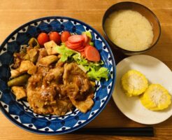 洋風丼 晩ごはんは洋風丼。 ささっと作ってのんびりくつろぐ夕方のひと時。 ポークチャップ丼とトウモロコシとみそ汁を食卓へ並べました。 ポークチャップは、ニンニクと玉ねぎと豚ロース薄切りを炒めて、塩コショウ、ケチャップ、ソ・・・