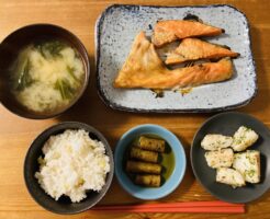 焼き鮭晩ごはん メインのおかずは焼いた鮭のアラ。 副菜は長芋の海苔塩揚げと、ゴボウの含め煮。 ごはんは小松菜の茎を入れた菜っ葉飯です。 お肉なしの晩ごはんですが、魚でタンパク質を補いました。 息子と私の大好物、鮭のアラ。・・・