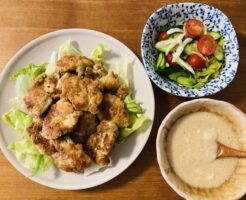 唐揚げ晩ごはん 晩ごはんのおかずはハーブ唐揚げ、長芋のとろろ、野菜サラダです。 長芋はネバリスターという粘りが強い種類で、いつもの長芋以上にぼたっとまとまり、すり器からお皿への移動が楽でした。 もちろん味もグー。 すった・・・