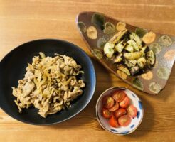 豚肉の晩ごはん① 晩ごはんの献立は豚肉と新じゃがとナスの炒め物、レモンクリーム海老コロッケ、キャロットラペ、ごはん、みそ汁です。 コロッケはスーパーのお惣菜のものを、魚焼きグリルでカリッと焼き直しました。 キャロットラペ・・・