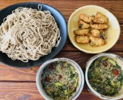 蕎麦 土曜日。息子と二人きりのおうちランチは蕎麦に決定。 山形のこんにゃく蕎麦と、焼いたさつま揚げ、山形の「だし」をイメージして作った蕎麦つゆを用意しました。 蕎麦つゆに入れた野菜や薬味は、ミニトマト、キュウリ、大葉、鰹・・・