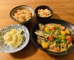 息子と二人の晩ごはん 夫ががゴルフ&飲み会でいない日の、息子と二人の晩ごはん。 献立はアクアパッツァ、ポテトサラダ、人参と塩昆布の炊き込みごはんです。 息子の夏休みの宿題で料理を作るというものがあったので、一緒に家にある・・・