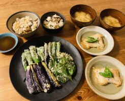 夏野菜と魚の天ぷら。キクラゲごはん
