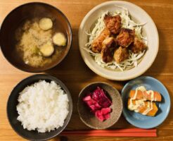 唐揚げと野菜 ある日の晩ごはん。 献立は唐揚げ、紫キャベツのピクルス、蒸し人参マヨ和え、ごはん、みそ汁です。 唐揚げは鶏胸肉で、下味は醤油、料理酒、生姜、ニンニク。 衣は小麦粉と片栗粉を半々にしました。 お・・・