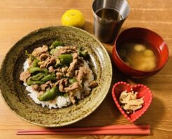 お疲れさまごはん 仕事後にパパっと作った晩ごはんです。 夫は飲み会でおらず、息子と二人分なのでより気軽に作れました。 豚肉とピーマンの炒め物をごはんにのせ、小鉢に作り置きのえのき味噌をのせ、みそ汁とみかんを添えたら出来上・・・