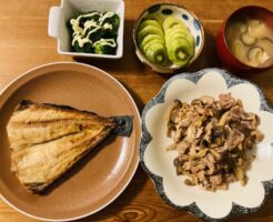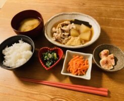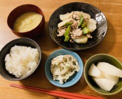 洋食 パッと見は和食っぽいですが実は洋食です。の巻。 献立は、豚肉とカブのガーリックソテー、レンコンサラダ、梨、ごはん、安納芋のポタージュです。 レンコンサラダはレンチンしたレンコンに塩コショウ、マヨ、ドライパセリを和え・・・