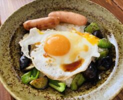 朝食みたいなランチ 休日のお昼のワンプレートごはんです。 ごはんの上に目玉焼きとウインナー、ピーマンとナスの炒め物をのせました。 ひとつのフライパンで全部焼けて簡単で時短。しかも安定の美味しさ。 目玉焼きとウインナーがま・・・