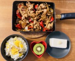 安納芋ごはん 安納芋ごはんが主役のお昼です。 夜の分も多めに炊きました。 おかずは豚肉と赤ピーマンと玉ねぎの甘辛炒め。 生姜をきかせてパンチのある味にしました。 豚肉と野菜を炒めて、醤油、みりん、蜂蜜、ゴマを加えて混ぜた・・・