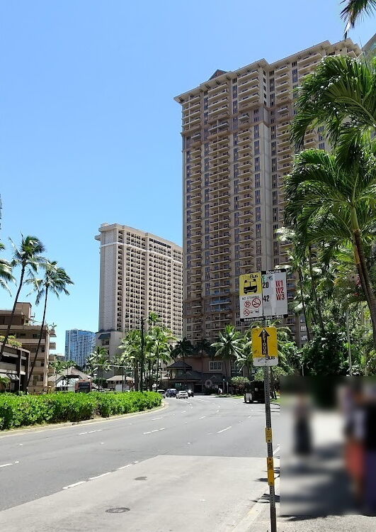 イリカイホテル前の停留所から、JCBカード提示で無料になるピンクラインのトロリーでワイキキへ。