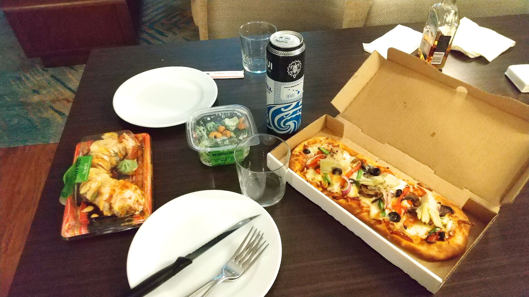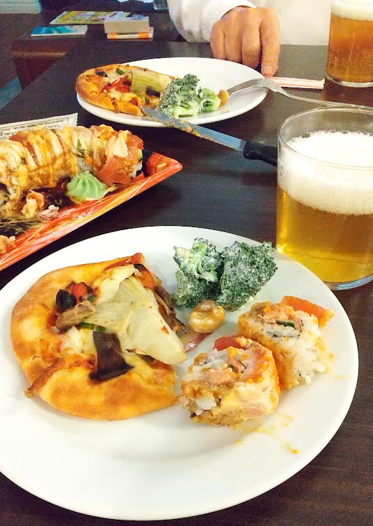 ピザとサラダとロール寿司。