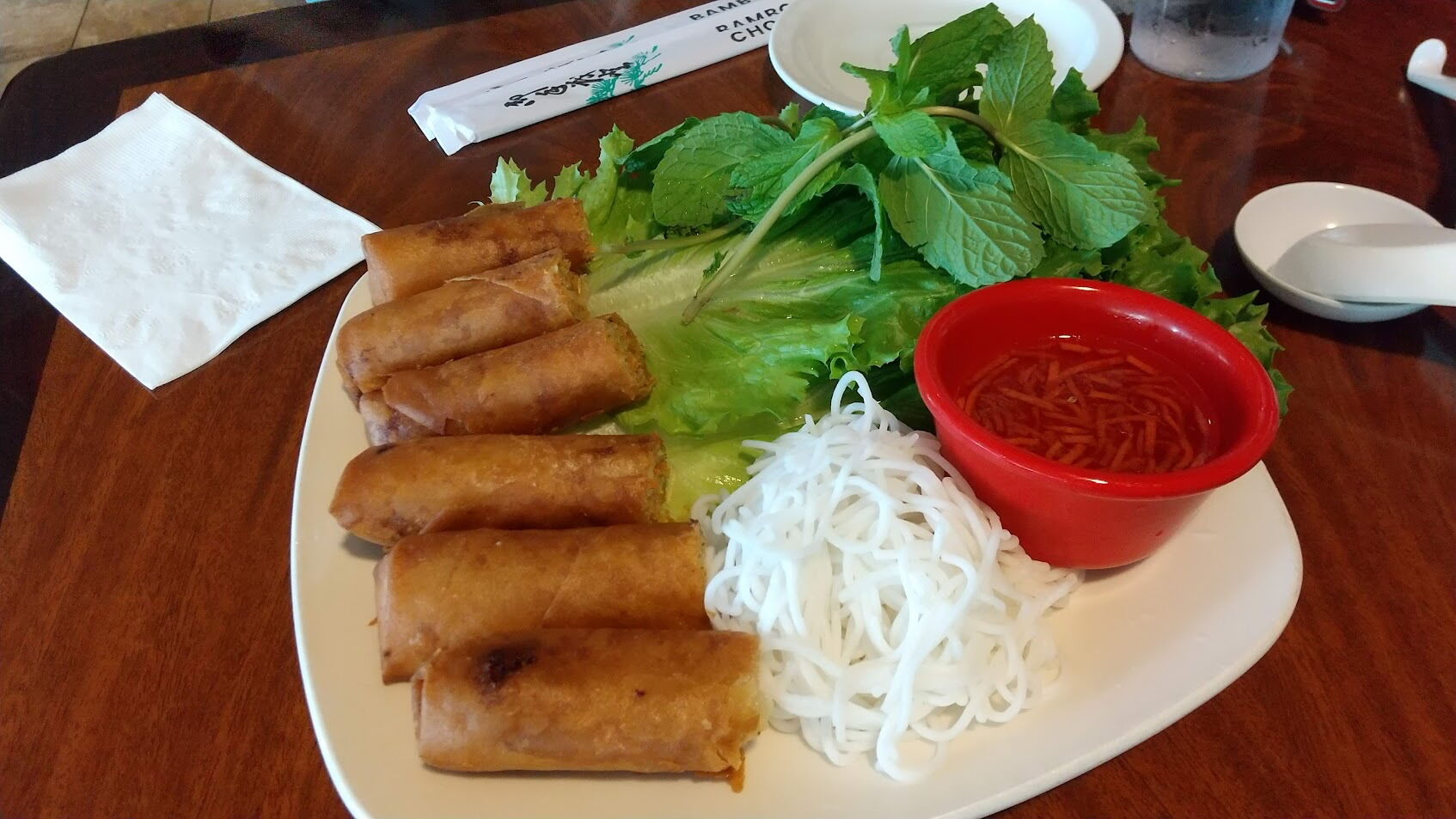 春巻きの脇にあるのが薬味で、レモン、ミント、パクチー、もやしなど。