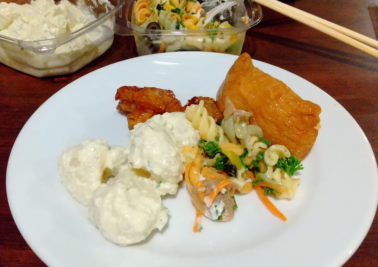 そんな中からポテサラ、ヤンニョムチキン?、いなり寿司(オットの希望)、パスタサラダなどを買ってきました。